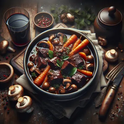 Tender chunks of beef are braised in red wine with aromatic herbs, mushrooms, and carrots. This dish may take some time to prepare, but its rich and deep flavors make it worth the effort.