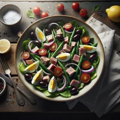 A refreshing salad originating from Nice, it features tuna, hard-boiled eggs, tomatoes, and olives over a bed of greens. Drizzle with olive oil and lemon juice for a light and satisfying meal.