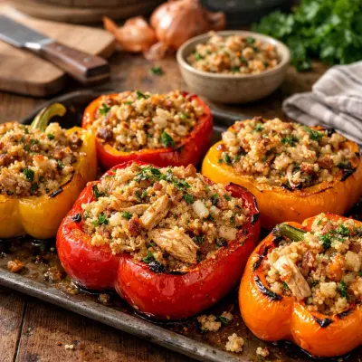 Bell peppers stuffed with a savory mix of chicken, quinoa, onions, and spices make for a protein-packed meal thatβs visually appealing and delicious.