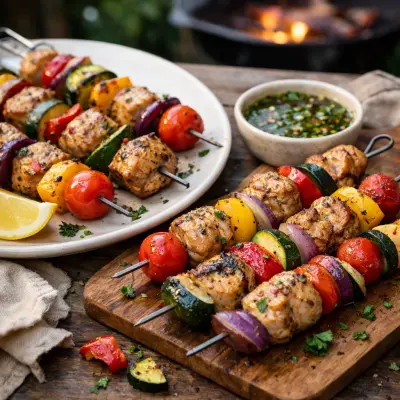 These skewers are easy to prepare and full of flavor. Marinade chicken pieces and your favorite vegetables in a mix of olive oil, lemon juice, and herbs, then grill to perfection.