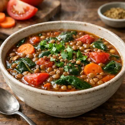 Rich in iron and proteins, this hearty stew combines lentils, spinach, carrots, and tomatoes, seasoned with cumin and coriander for a comforting and satisfying dish.