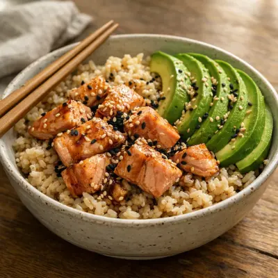 A delicious combination of omega-3-rich salmon and creamy avocado served over brown rice, topped with sesame seeds and soy sauce for a delightful post-exercise meal.