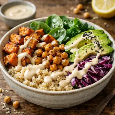 This vibrant bowl combines roasted sweet potatoes and chickpeas with quinoa, leafy greens, and a tahini dressing for a wholesome meal rich in nutrients.
