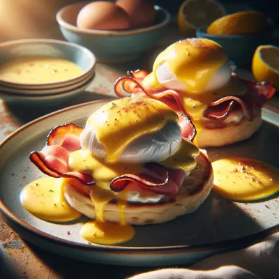 This brunch favorite features perfectly poached eggs and crispy Canadian bacon atop a toasted English muffin, all smothered in a rich, creamy Hollandaise sauce. It's a luxurious way to start the day.