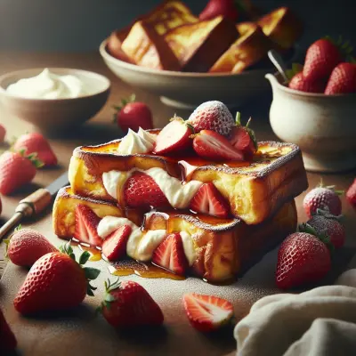 Indulge in stuffed French toast filled with cream cheese and fresh strawberries, then topped with a dusting of powdered sugar. It's a decadent dish that's perfect for a special brunch occasion.