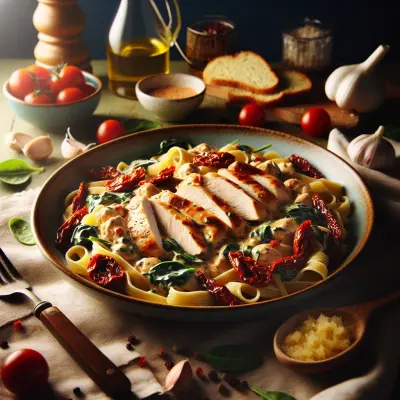 This indulgent pasta dish features tender chicken breasts smothered in a rich, creamy sauce with sundried tomatoes, spinach, and garlic. It's a comforting blend of flavors that brings a taste of Italy to your dinner table.