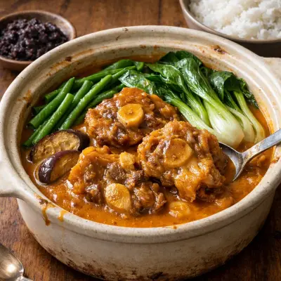 A comforting Filipino stew made with oxtail and peanut sauce, accompanied by vegetables like eggplant and green beans. Its creamy and nutty profile, enhanced by a dash of shrimp paste, offers a unique taste of Filipino home cooking.