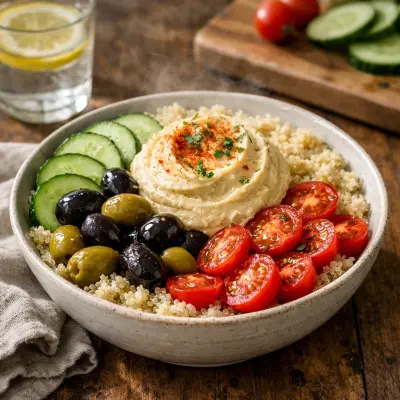 Combine quinoa, cucumber, olives, and cherry tomatoes with a dollop of hummus for a Mediterranean-inspired breakfast bowl. This savory option is a great way to incorporate more vegetables and plant-based protein into your morning routine.