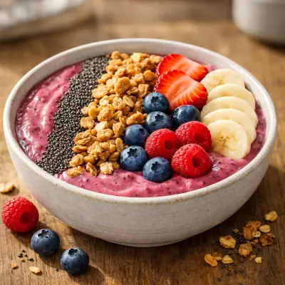 This berry smoothie bowl is as beautiful as it is tasty. Blend your favorite berries with a banana and top with chia seeds, granola, and fresh fruit for a refreshing start to your day.