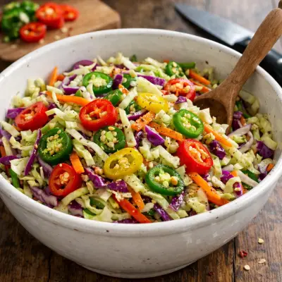 A crunchy slaw made with cabbage, carrots, and a variety of hot peppers provides a refreshing yet spicy side dish. It's a vibrant addition to any BBQ meal.