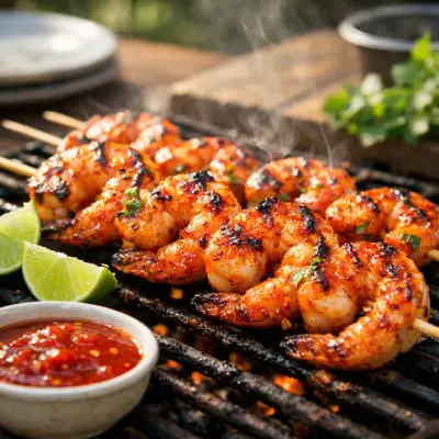 Juicy shrimp are marinated in a mixture of sriracha, lime juice, and garlic, then skewered and grilled for a quick and spicy treat. Perfect for seafood lovers looking to spice things up.