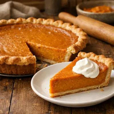 A traditional favorite, this pumpkin pie features a rich and creamy filling with warm spices like cinnamon and nutmeg, all nestled in a flaky crust. It's the quintessential autumn dessert that pairs perfectly with a dollop of whipped cream.