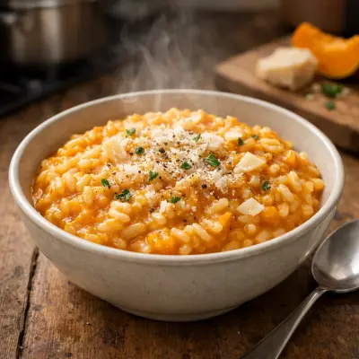 Indulge in a savory take on pumpkin with this creamy risotto. Arborio rice is cooked slowly with pumpkin puree and broth, finished with parmesan cheese for a luxurious and comforting meal.